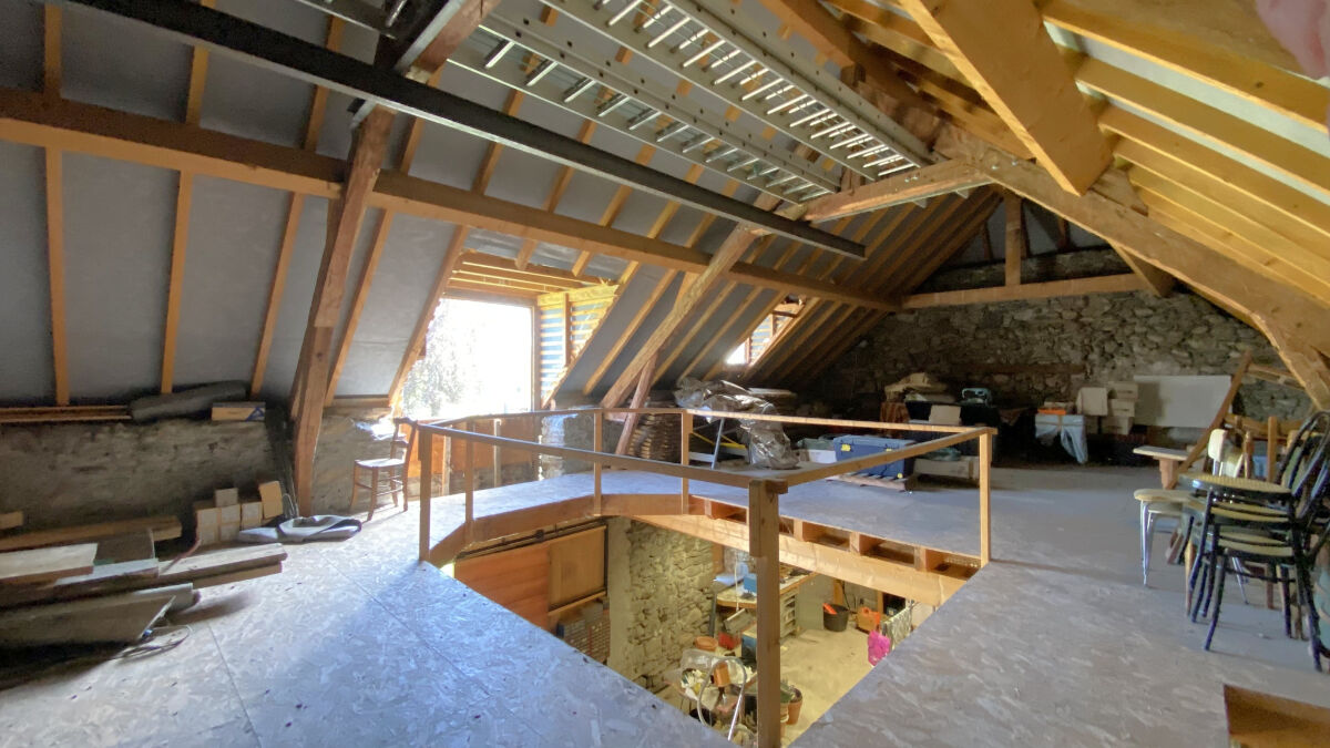 Dans la grange attenante, on trouve un atelier/garage de 60 m2 au rez-de-chaussée et un grenier d'environ 70 m2 en loi Carrez.